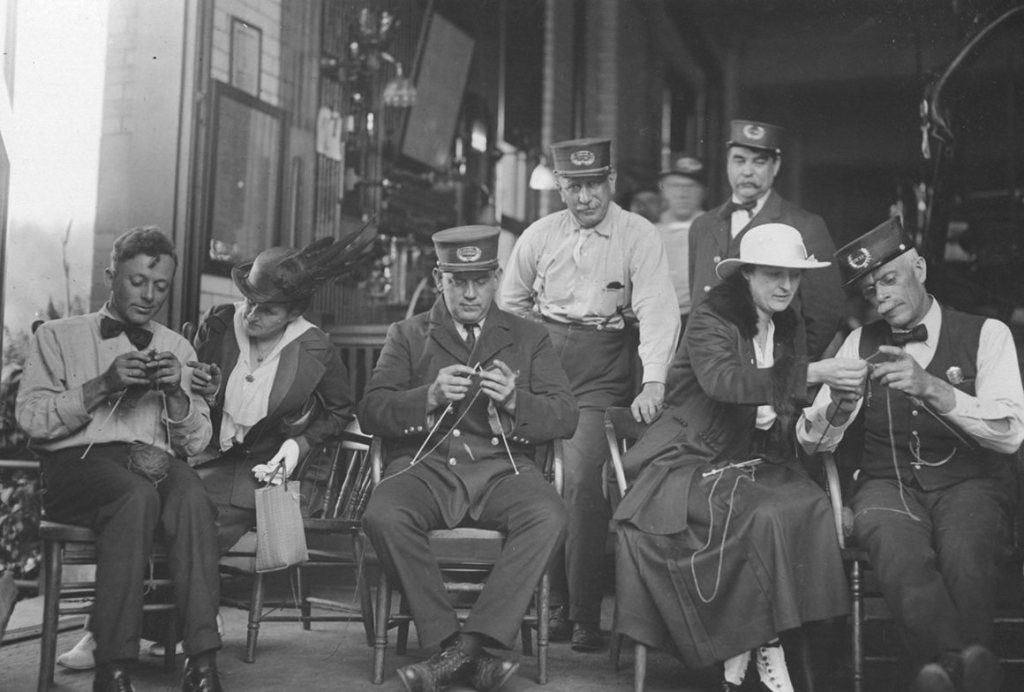 Cincinnati firemen being taught to knit by members of the American Red Cross, 1918, from the US National Archives