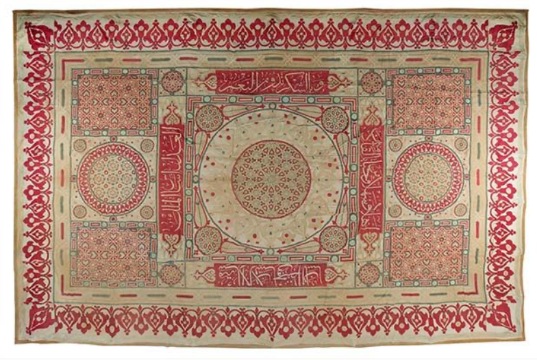 “Thatcher Panel,” example of Egyptian appliqué work, 1920s, Egypt, brought by a wealthy American traveller to Egypt and passed down through their family. Inscriptions read: “Justice is the key to dominion,” “the wellbeing of man is in controlling his tongue,” “welcome to those approaching,” and “through gratitude bounty increases”