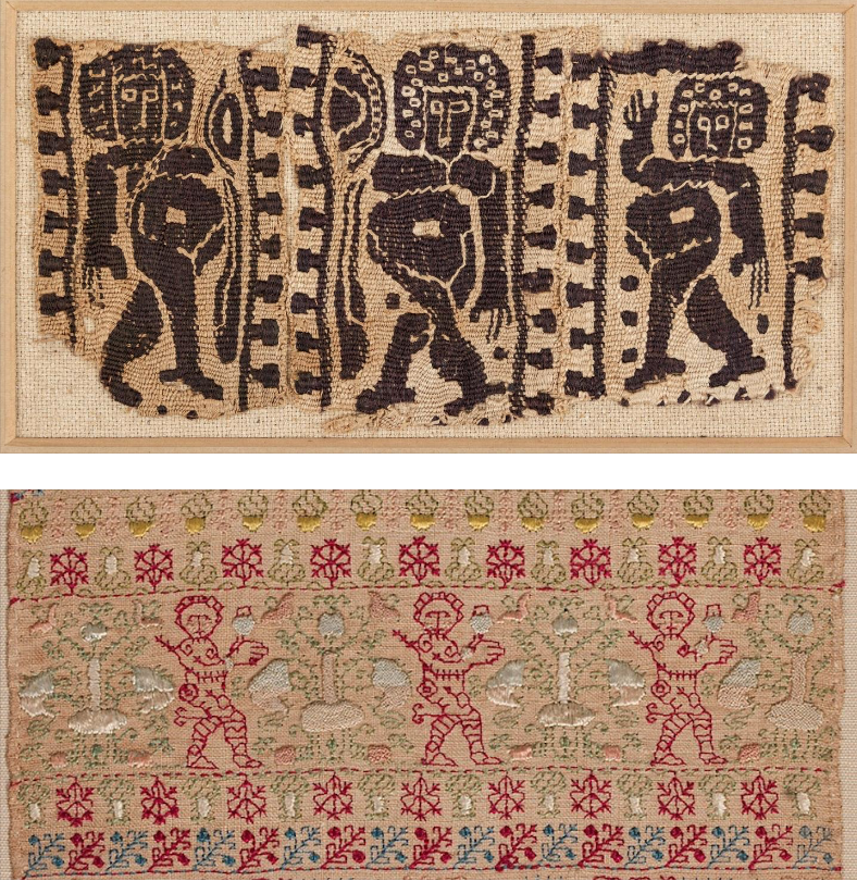 “Ancient woven Coptic textile fragments,” 5-7th century, Egypt, PBA Galleries and “boxers” from sampler, Mary Pots, 1648, Metropolitan Museum of Art