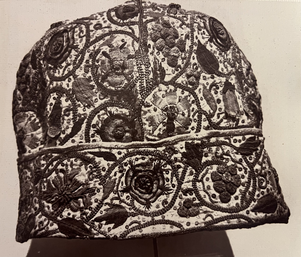 Nightcap, English, c. 1600, lent by Mrs Baker and photographed by Isabel Agnes Cowper. Illustrated in the Catalogue of the Special Loan Exhibition of Decorative Art Needlework (London, 1874).