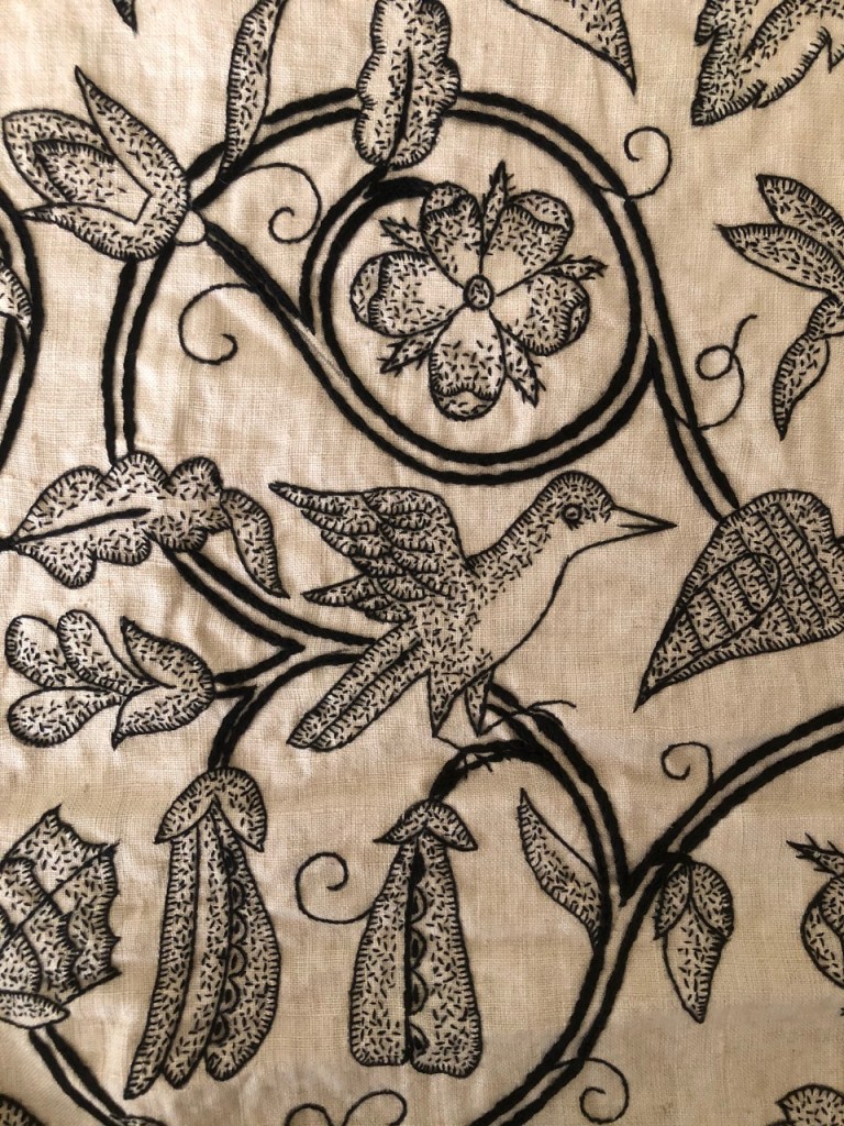 Blackwork portiere, late 19th century, designed by the Royal School of Art Needlework, detail. Inspired by an early 17th century jacket in the Isham collection displayed at the Special Loan Exhibition of Decorative Art Needlework, 1873. Private collection.