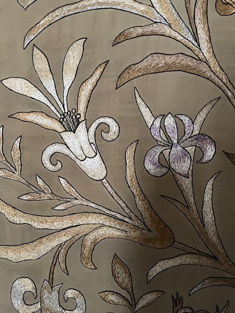 Floriated wall panel, designed by Gertrude Jekyll, 1874, and stitched by the RSAN, 1875-1880 for the Duke of Westminster, detail. Private collection.