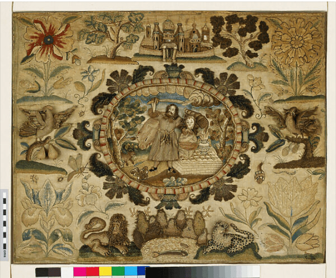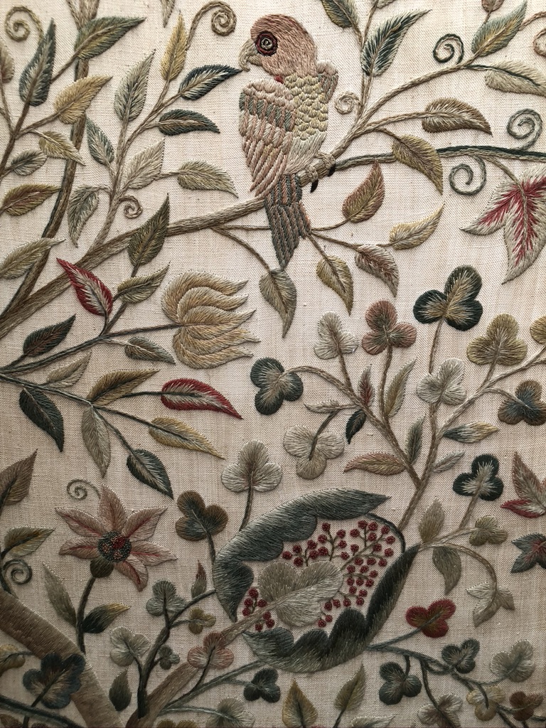 Four-panel Crewelwork screen in the Jacobean style, attributed to the RSAN, late 19th century, detail. Private collection.