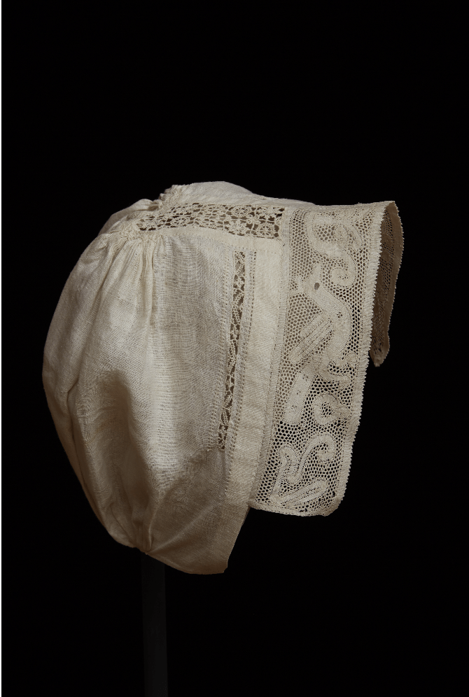 Bonnet with reticella needle-lace and bobbin-lace inserts, 1600–50. Linen. Textilmuseum St. Gallen, Acquired from the Estate of John Jacoby, 1954, 23402. Photograph: Michael Rast.