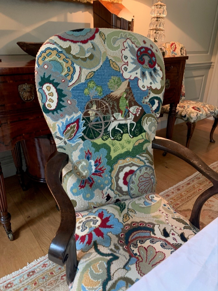 A set of 14 dining chairs commissioned by a private client, featuring needlework inspired by medieval hunting scenes.