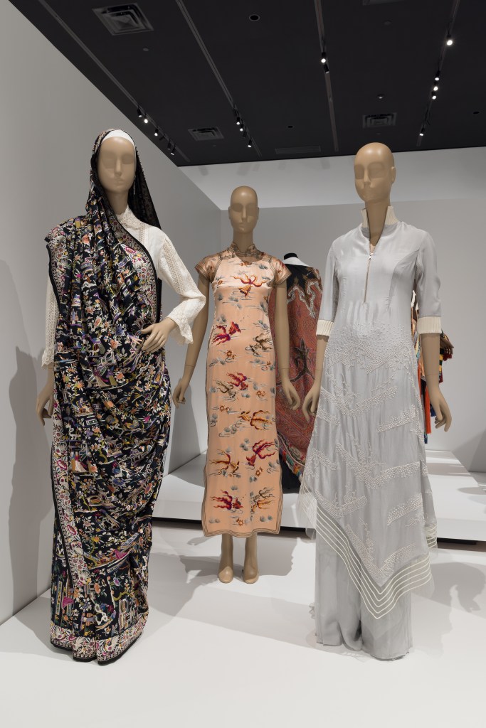 Installation showing sari, qipao, and Rahul Mishra dress in the Art X Fashion exhibition, 2026 ©The Museum at FIT