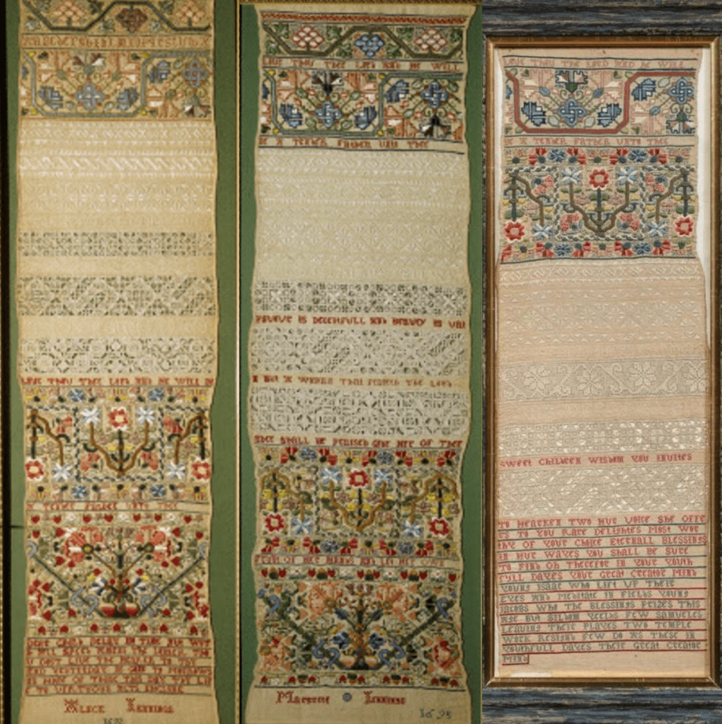 Samplers by Alice Jennings, Margaret Jennings, and unnamed Jennings sister, 1692, 1695, undated, National Trust and private collection