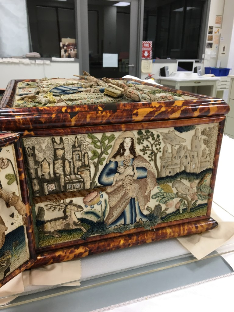 “Embroidered Raised Work Casket,” 1674, England, Colonial Williamsburg.