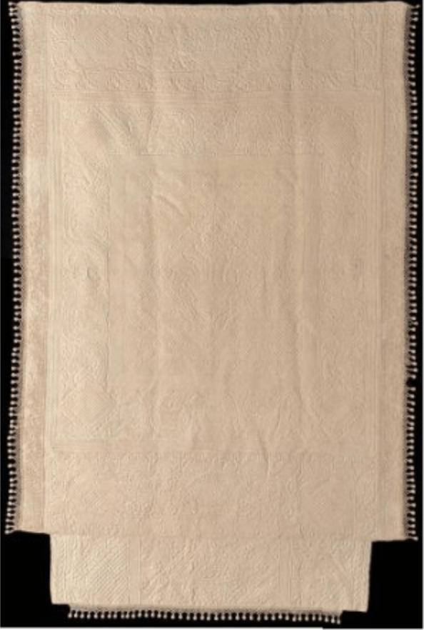 “Quilt, White Stuffed Work,” c. 1830, made in France but used in Williamsburg, Virginia, Colonial Williamsburg. This is the quilt wet cleaned by Gretchen and Jackie in 2019.