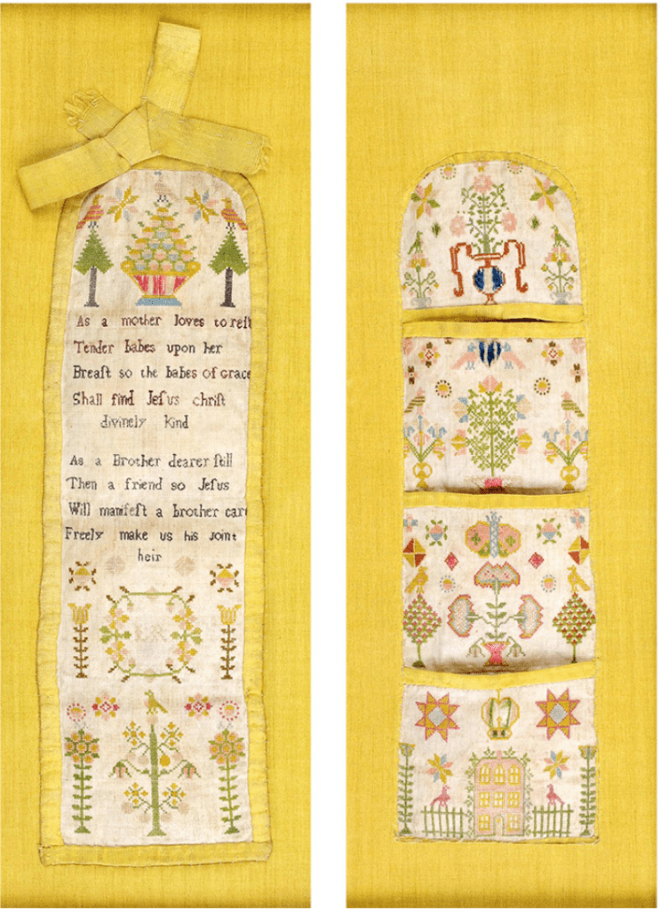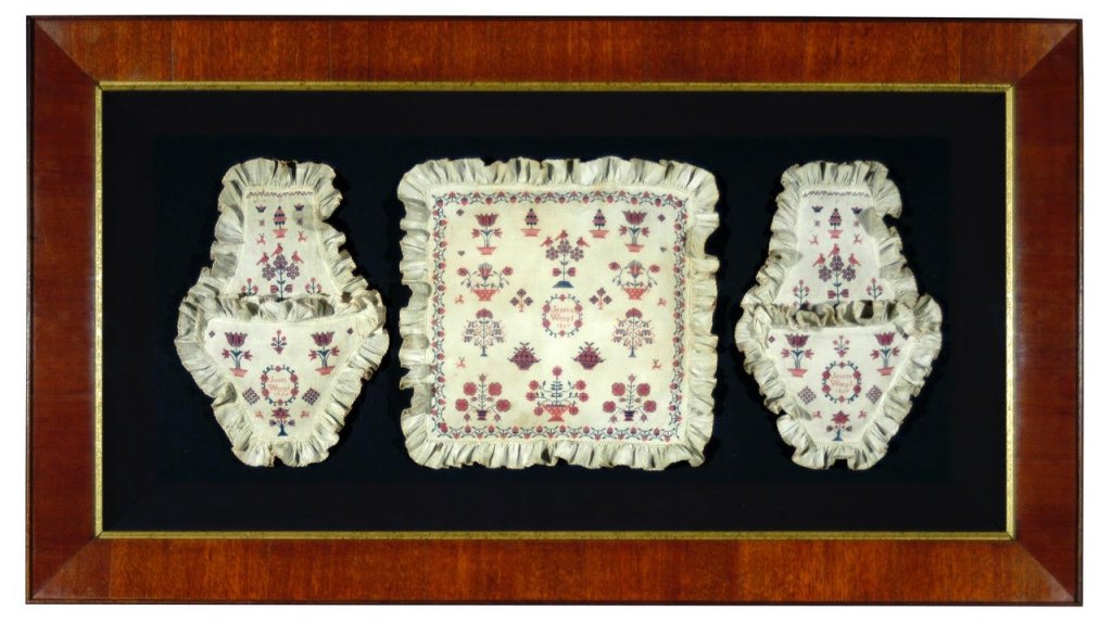 Watch holder, watch glass cover, three samplers, M. Elliott, 30 June 1822, from Witney Antiques