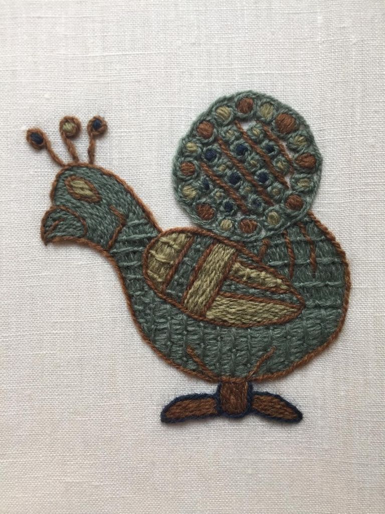 Alexandra’s recreation of one of a pair of peacocks in the border of the Bayeux Tapestry