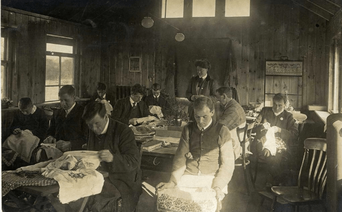 Louisa Pesel teaching soldiers to stitch, Leeds University Library