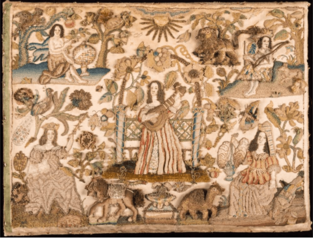 Raised work picture showing Harmony and the Four Continents, 1650-75, England, Colonial Williamsburg